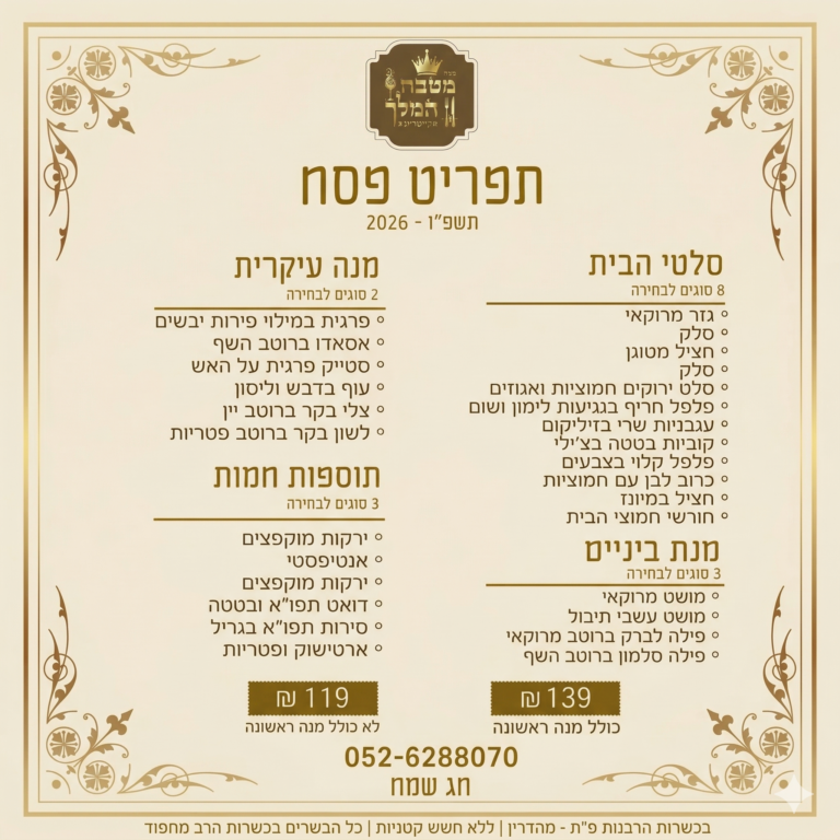 קייטרינג "מטבח המלך" מציע לכם תפריט פסח עשיר, חגיגי וכשר למהדרין (ללא חשש קטניות),